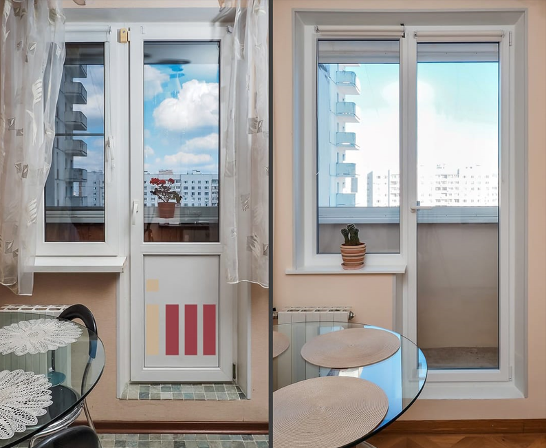 На фото ниже пластиковая балконная дверь (слева) и балконная дверь из стеклокомпозита (справа). Замена пластиковой балконной двери на стеклокомпозитную балконную дверь увеличила поток солнечного света в данную кухню на 70 процентов.