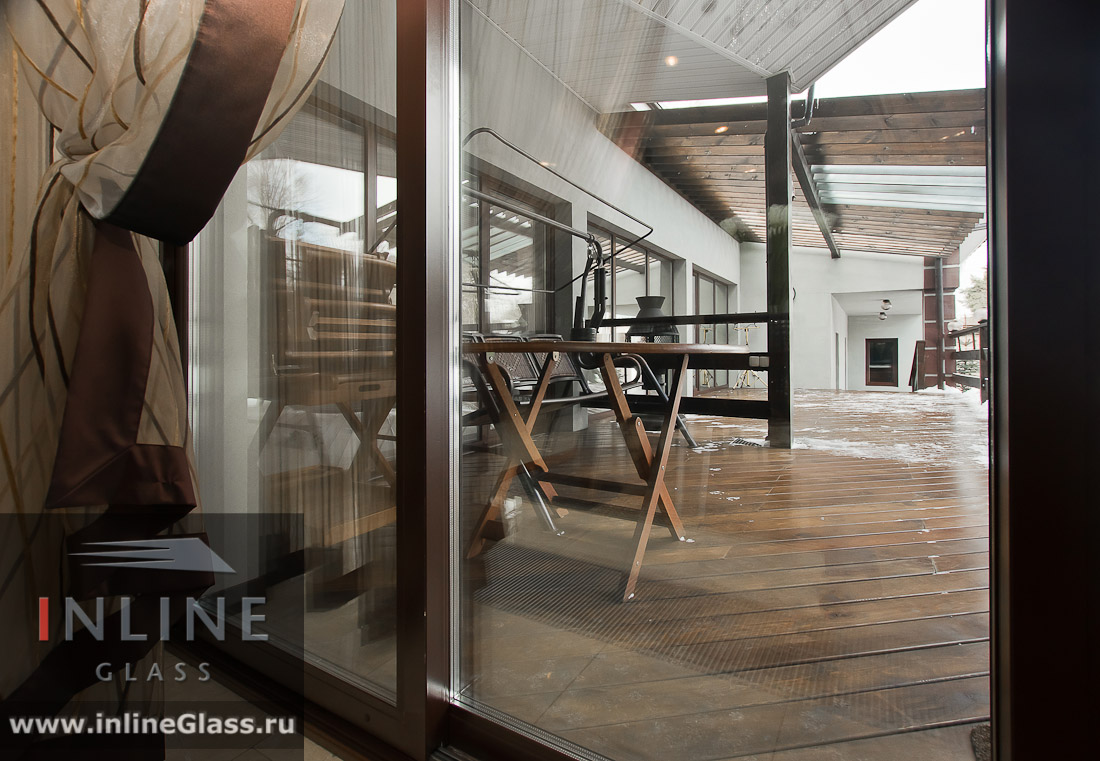 Обратите внимание на фотографию порога раздвижной двери. При остеклении террас зачастую приходится скрывать рамные конструкции в полу. В нашей практике встречаются три варианта установки порога раздвижной двери: вровень с поверхностью пола, полностью над полом и промежуточный вариант. Вариант установки вровень с поверхностью пола очень удобен, так как при открытой створке раздвижной двери отсутствует порожек, и предметы можно спокойно перемещать безо всяких препятствий. В частности, на фотографии изображен порог раздвижной двери террасы в доме инвалидов, где жестким требованием была возможность свободного проезда инвалидной коляски через проем двери.