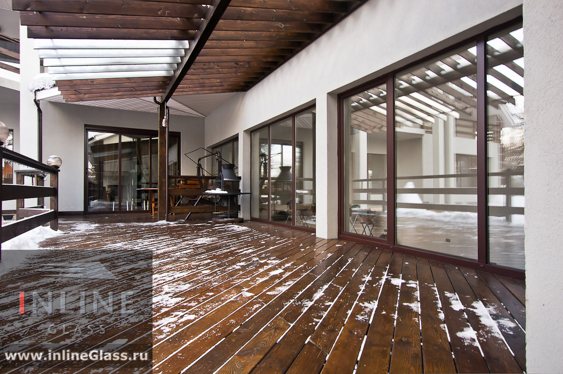 Остекление террасы является одним из наиболее распространенных вариантов применения стеклокомпозитного профиля. Благодаря своей механической прочности, стеклокомпозит способен выдерживать очень большие нагрузки. Это его качество мы используем при производстве раздвижных дверей очень больших размеров. Размер створки раздвижной двери может составлять более 3-х метров в высоту и 1.5 метра в ширину. Таким образом, из подобных раздвигающихся стеклянных створок может быть набрана сколь угодно широкая стеклянная конструкция. Некоторые называют такие изделия стеклянными стенами, некоторые - витринами.