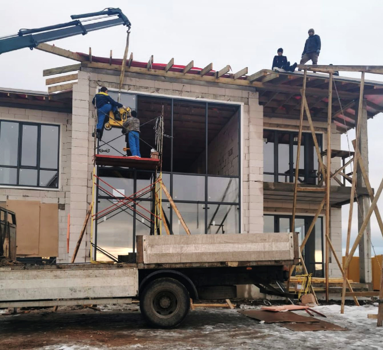 Очень современно и света много! Монтажники работают четко и профессионально! Чего стоит один монтаж большого витража!!!! (Фото) Его монтаж пришли снимать все соседи)) Специально снял фото, на память! Буду писать книгу - "Как построить дом", где обязательно расскажу о Вас!